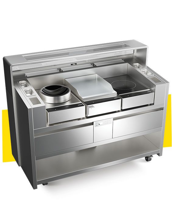 Cuisine mobile polyvalente pouvant être personnalisée en combinant différentes fonctions de cuisson.